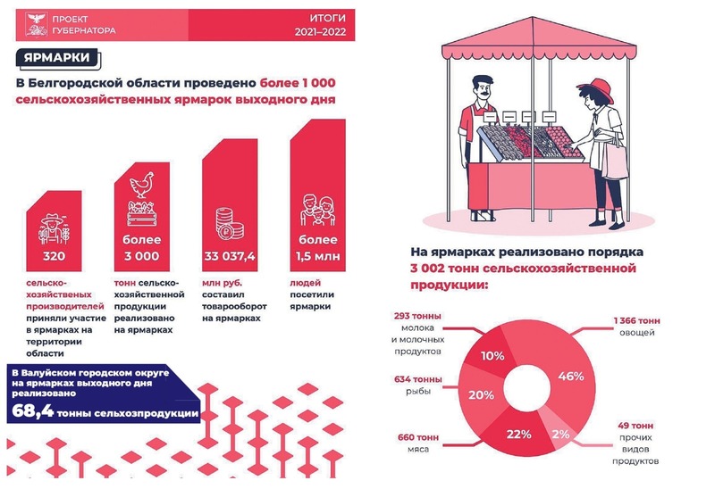 В Валуйском городском округе в 2022 году провели 50 сельскохозяйственных ярмарок выходного дня. На прилавках была представлена мясная, молочная продукция, живая рыба, сезонные овощи, фрукты, зелень, ягоды, рыба, мёд от местных сельскохозяйственных товаропроизводителей, крестьянско-фермерских хозяйств и валуйчан, ведущих личные подсобные хозяйства.