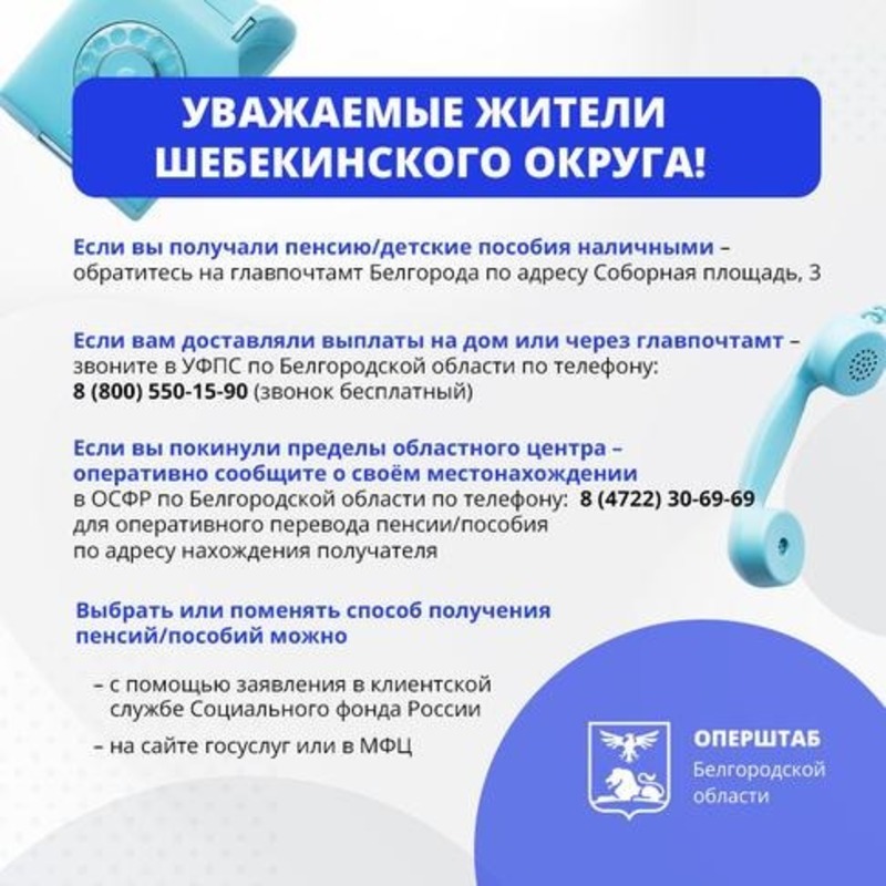 Шебекинцам, которые покинули Белгород, чтобы оперативно получить пенсию и пособия, нужно сообщить о своём местонахождении в областной социальный фонд по телефону (47–22) 30–69–69 . Также можно поменять способ получения выплат, написав заявление в клиентскую службу Социального фонда России, на сайте госуслуг или в МФЦ.