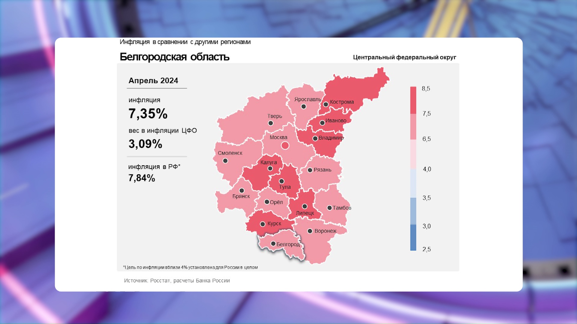 «Рост цен на услуги продолжил замедляться в большинстве российских регионов, не только у нас. Наиболее заметно, если говорить конкретно о Белгородской области, – на туристические услуги. В целом годовая инфляция в нашем регионе в апреле 2024 года увеличилась и составила 7,35%. При этом её уровень по-прежнему ниже, чем в ЦФО и в России», – прокомментировал управляющий белгородским отделением Банка России Андрей Беленко.