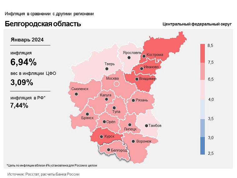 Годовая инфляция в Белгородской области в январе 2024 года составила 6,94%. Это ниже уровня по России в целом (7,44%) и по Центральному федеральному округу (7,31%).