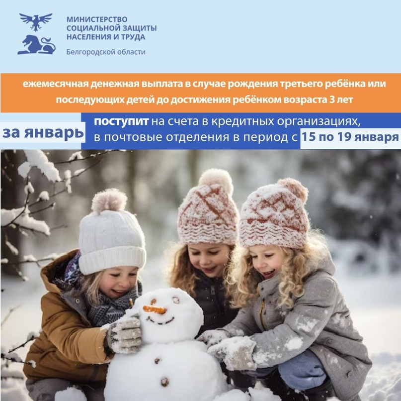 Информация о сроках поступления ежемесячной денежной выплаты в случае рождения третьего ребёнка или последующих детей до достижения ребёнком возраста 3 лет за январь 2024.