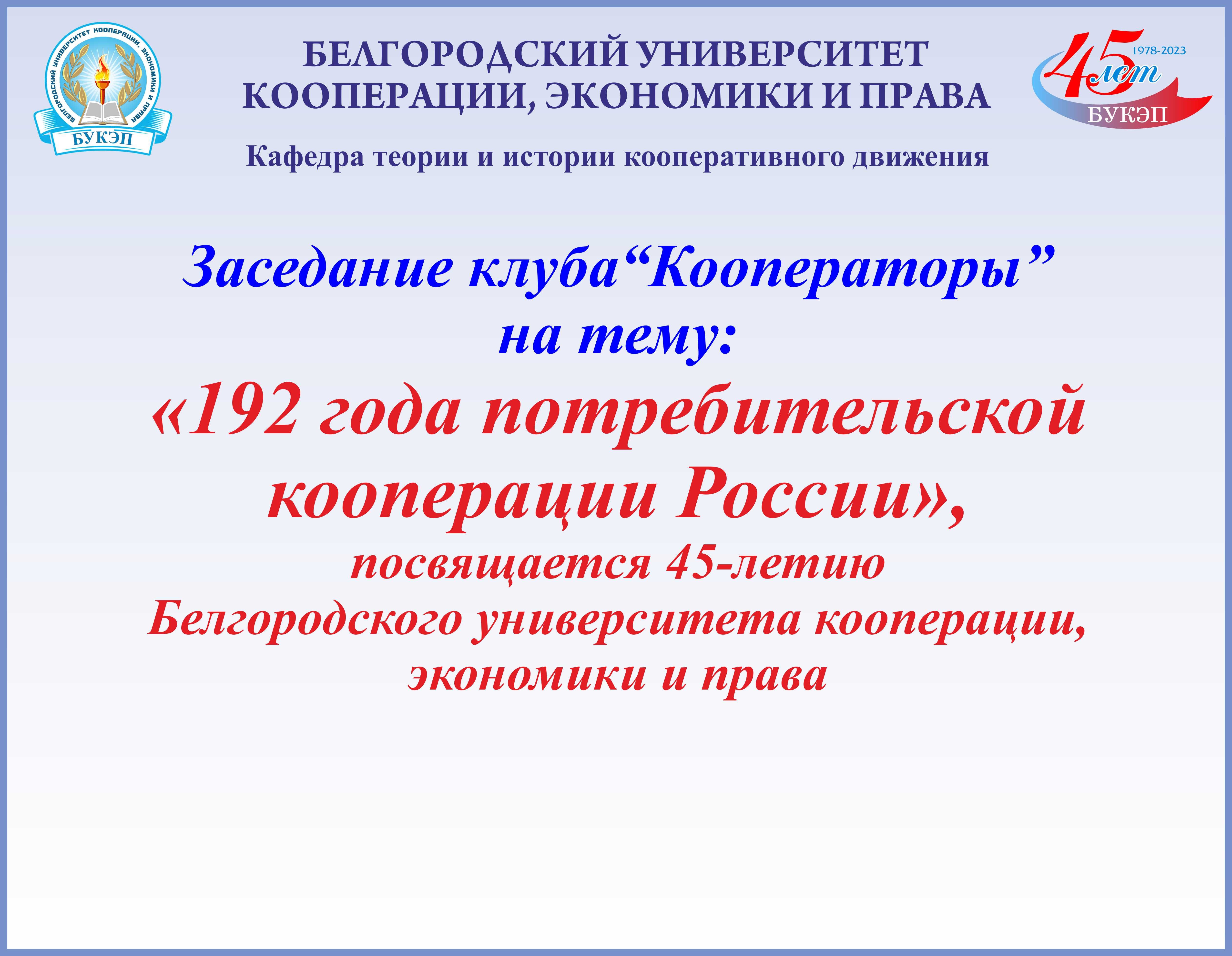 Кафедра теории и истории проводит цикл заседаний клуба «Кооператоры», посвященный знаменательной дате на тему «192 года потребительской кооперации России» (в рамках реализации проекта ЮНЕСКО и 45-летию Белгородского унив