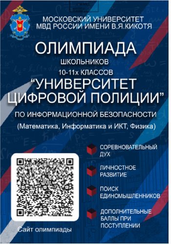 В Московском университете МВД России имени В.Я.Кикотя организовано проведение в 2023-2024 учебном году олимпиады школьников «Университет цифровой полиции» по информационной безопасности.
