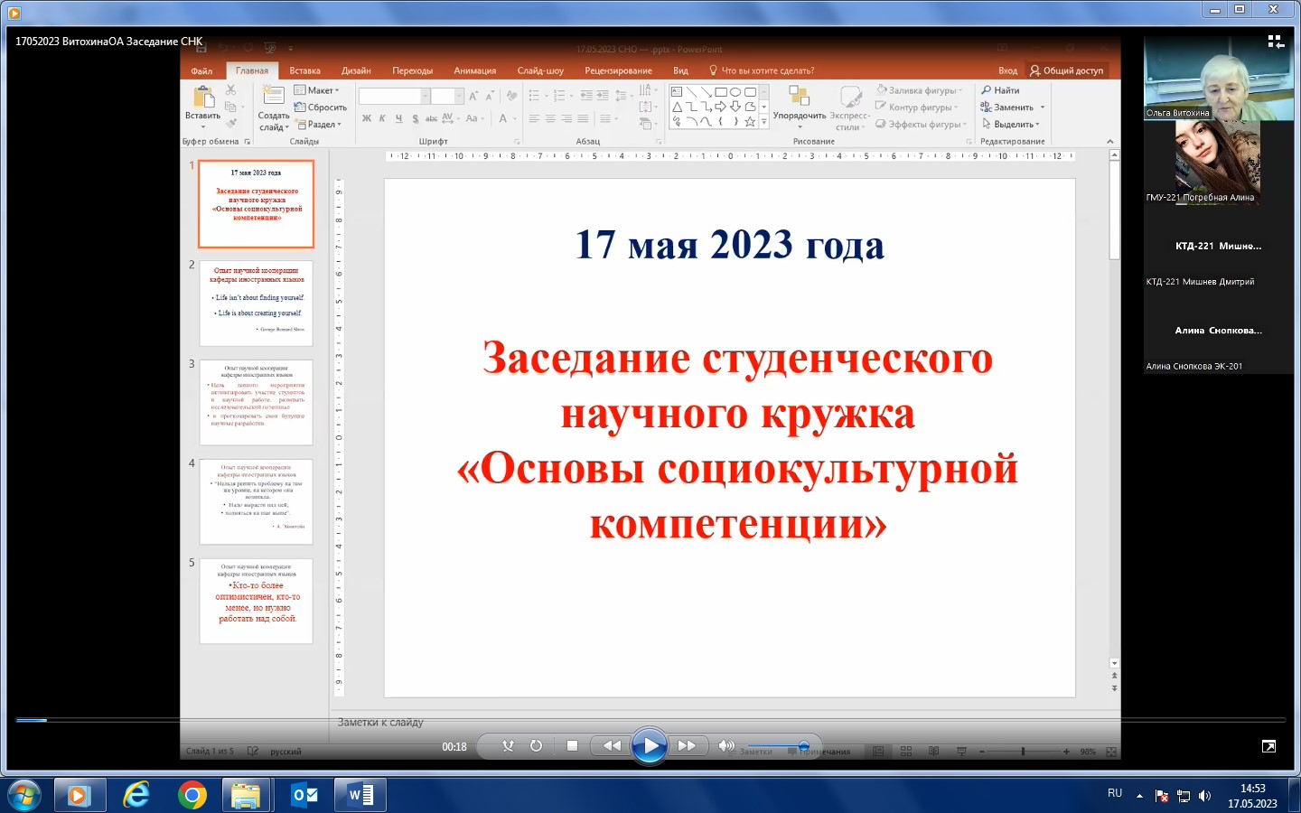17 мая студенческий научный кружок «Особенности социокультурной компетенции», работающий на кафедре иностранных языков, завершил цикл заседаний.