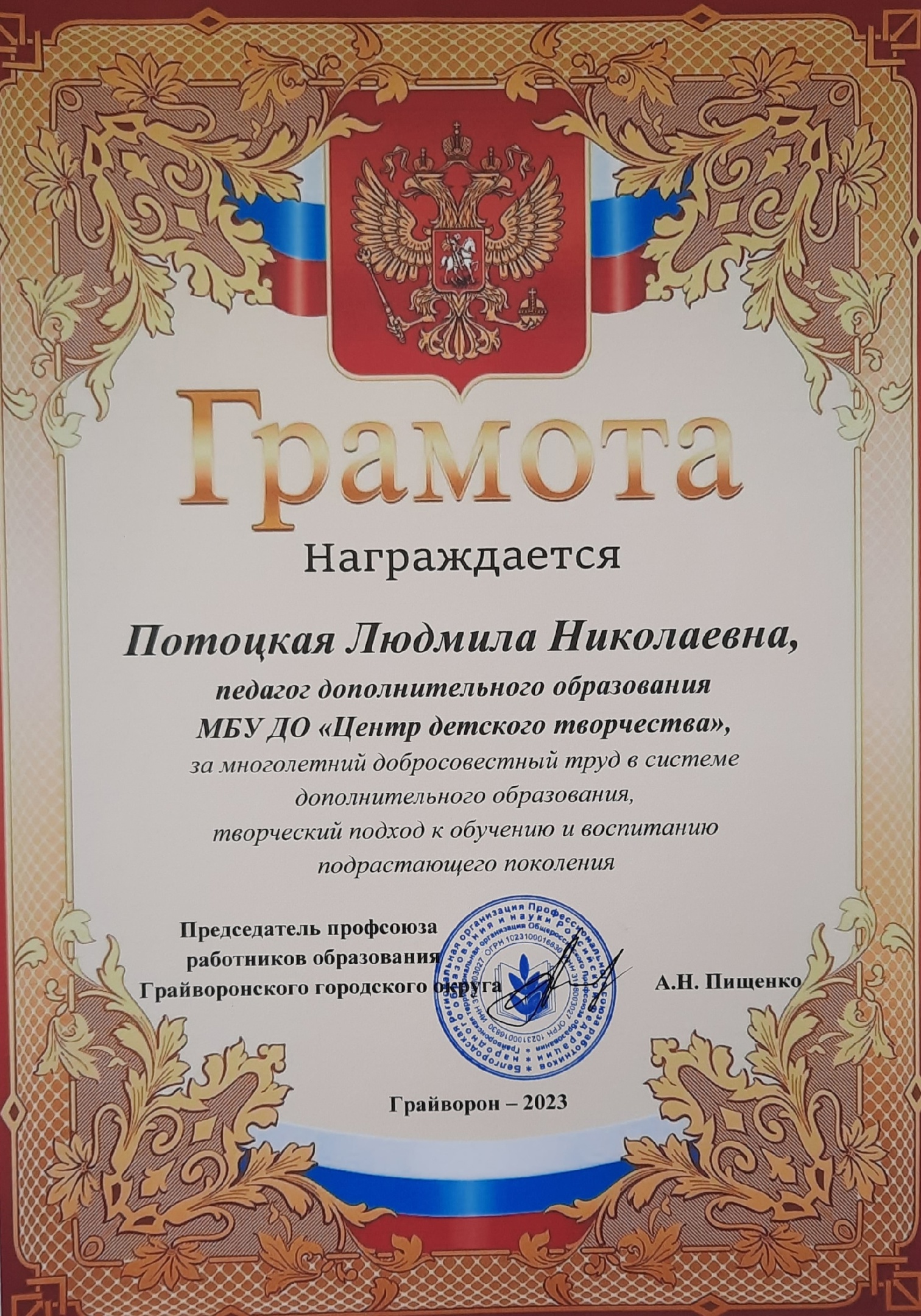 Педагог дополнительного образования Центра детского творчества Людмила Николаевна Потоцкая отмечает профессиональный и творческий тридцатилетний юбилей педагогической деятельности. На протяжении многих лет Людмила Николаевна проявляет себя как активный работник, любящий детей и обладающий высокой трудоспособностью и энергией. В честь такого знаменательного события Людмила Николаевна награждена грамотой профсоюзной организации Грайворонского городского округа за многолетний и добросовестный труд в системе дополнительного образования, творческий подход к обучению и воспитанию подрастающего поколения.