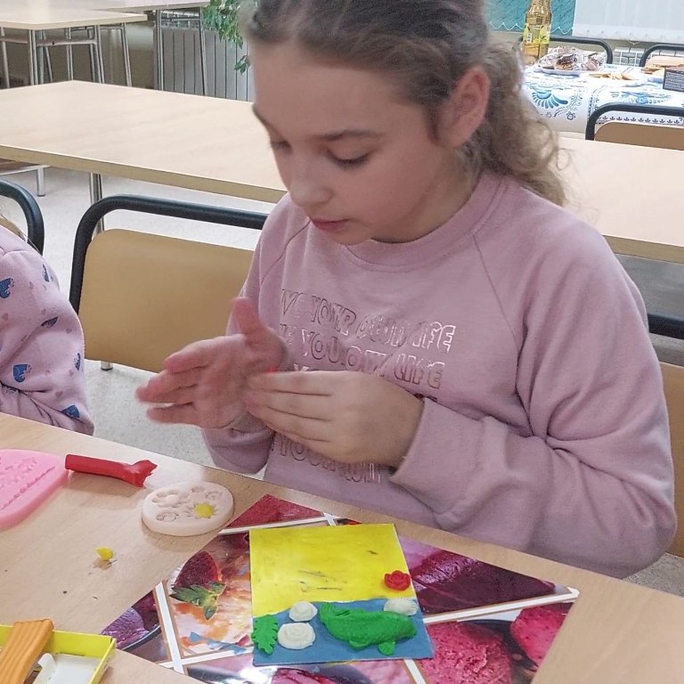 А вот Елена Чернова, преподаватель по изобразительному искусству, организовала для участников мастер класс по пластилинографии с применением силиконовых молдов. Взрослые и дети с удовольствием увлеклись созданием красочных картин из пластилина. Также присутствующие смогли познакомиться с удивительными работами Елены Сергеевны, представленными в зале.