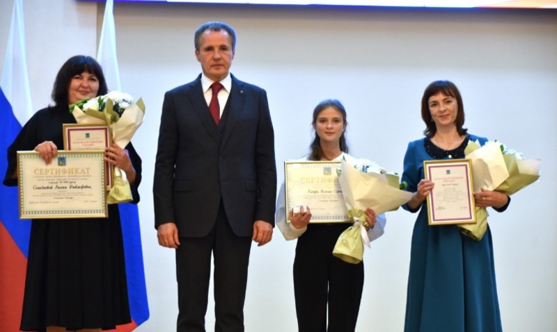 Вячеслав Гладков вручил именные стипендии наиболее отличившимся. 50 ребят будут получать денежное поощрение в размере 5 тыс. рублей каждый месяц. Их педагогам передали сертификаты на единовременную выплату в 50 тыс. рублей .