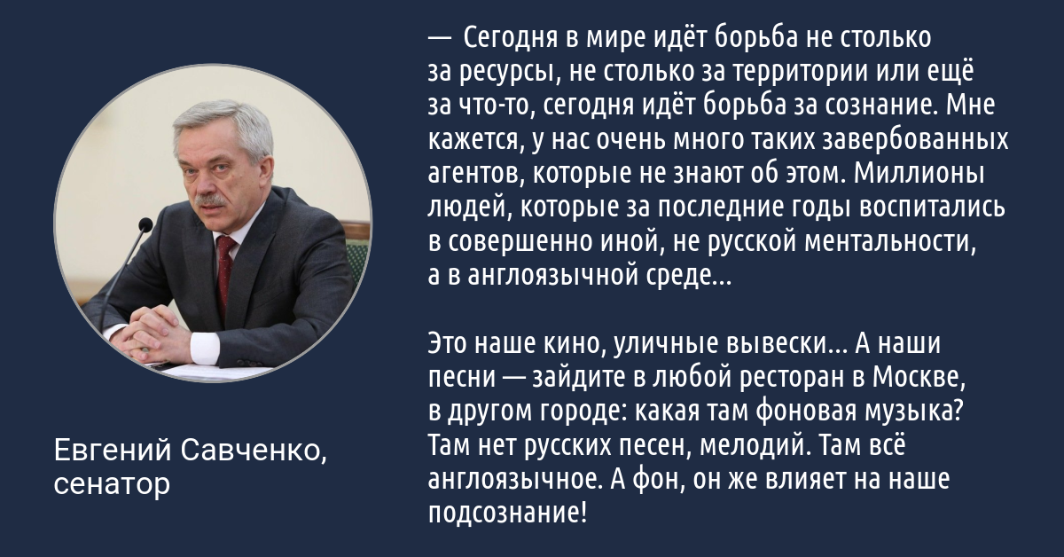 — Сегодня в мире идёт борьба не столько за ресурсы, не столько за территории или ещё за что-то, сегодня идёт борьба за сознание. Мне кажется, у нас очень много таких завербованных агентов, которые не знают об этом. Миллионы людей, которые за последние годы воспитались в совершенно иной, не русской ментальности, а в англоязычной среде, — считает политик. По словам сенатора, россияне уже последние 20–30 лет живут в англоязычной среде. «Это наше кино, уличные вывески... А наши песни — зайдите в любой ресторан в Москве, в другом городе: какая там фоновая музыка? Там нет русских песен, мелодий. Там всё англоязычное. А фон, он же влияет на наше подсознание!», — объяснял коллегам серьёзность проблемы Савченко.Переломить ситуацию, по мнению российского сенатора, должно российское министерство культуры. О механизмах влияния, экс-губернатор не говорил: будет ли это введение цензуры или конкурентная борьба за внимание слушателей.