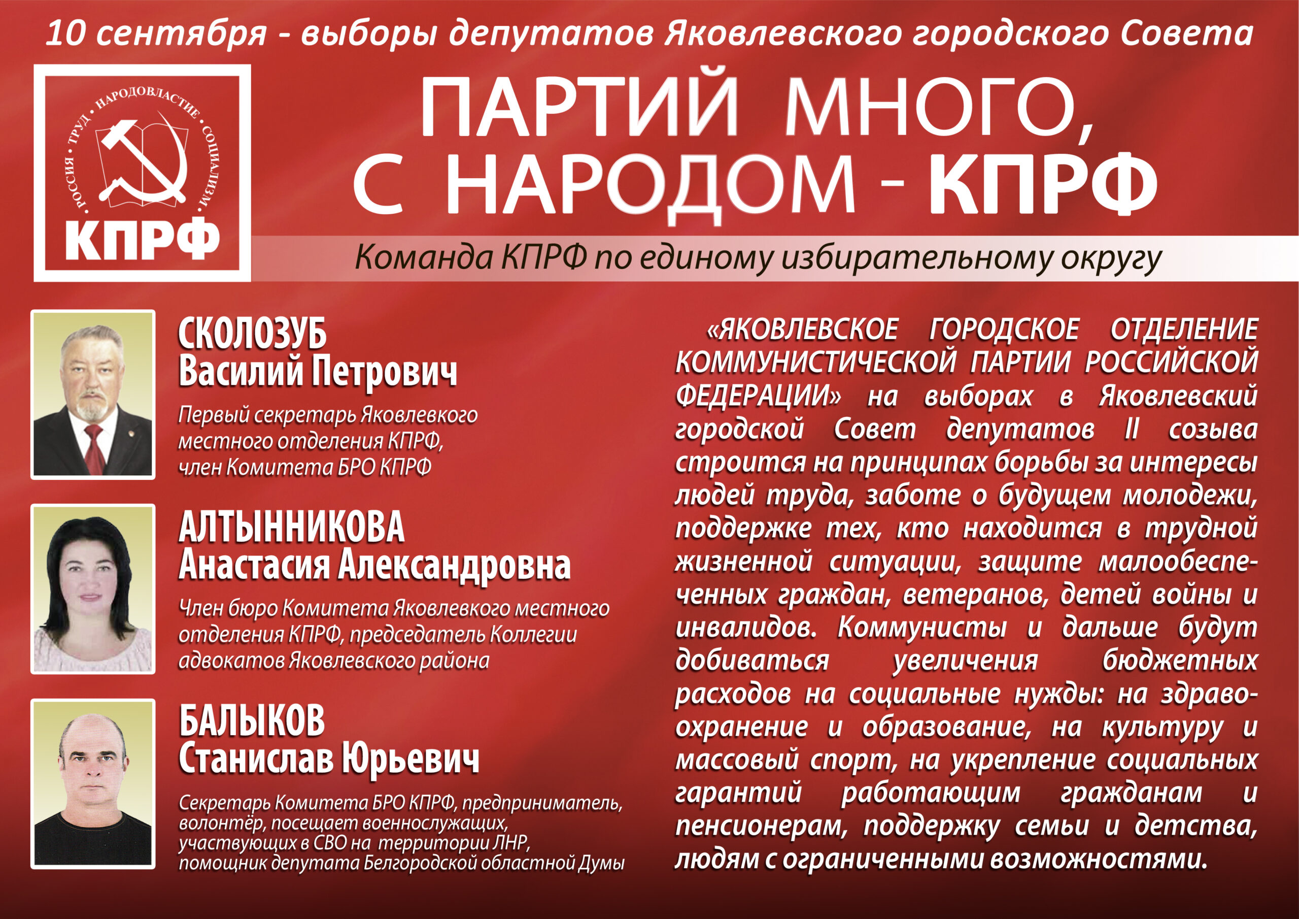 Голосуя за команду КПРФ, вы голосуете за подлинные изменения к лучшему, за достойную жизнь каждого жителя Яковлевского городского округа, за будущее ваших детей и внуков!