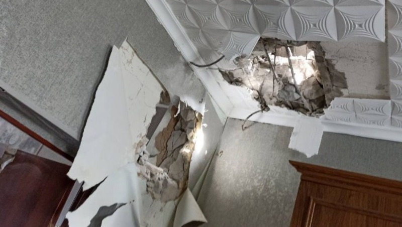 Снаряд пробил крышу жилого дома и повредил стены и мебель в двух комнатах. Людей внутри, по счастливой случайности, не было.
