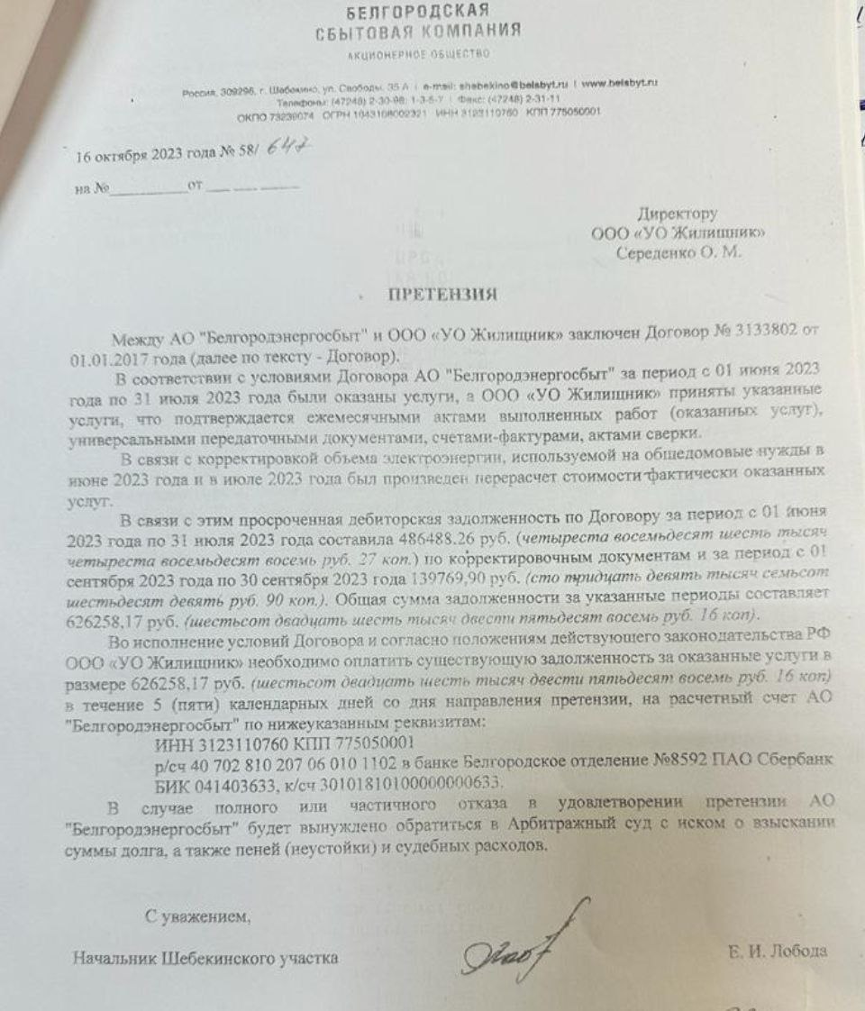 Телеграм-канал «Юристы31/Online» опубликовал копии претензий, которые компания «Белгородэнергосбыт» разослала шебекинским управляющим компаниям. В них энергетики со ссылкой на договор просят оплатить организации долги за период с 1 июня по 31 июля 2023 года. Так, управляющей организации «Жилищник» они выставили счёт на 626,3 тысячи рублей, ООО «Шебекино-дом» — 407,4 тысячи рублей, управляющей компании «Шебекинское» — 53,2 тысячи рублей, «Городской УК» — 218,9 тысячи рублей. Суммы, как гласит текст письма, указаны с учётом перерасчёта.