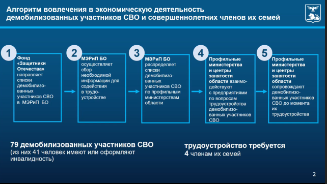 Списки демобилизованных в правительство подаёт фонд «Защитники Отечества», далее сотрудники министерства собирают нужную информацию, чтобы помочь людям, которых подал фонд. На следующем этапе минэкономразвития уже самостоятельно передаёт списки демобилизованных и членов их семей по другим министерствам и управлениям, учитывая информацию об образовании бывших участников СВО, которую они получили. Дальше министерства начинают работать с предприятиями, которые могут взять на работу демобилизованных, и сопровождают их до завершения трудоустройства.