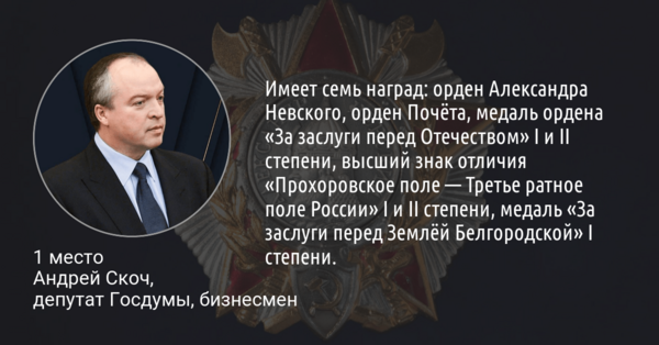 После недавнего награждения депутата облдумы Сергея Гусева медалью ордена «За заслуги перед Отечеством» I степени Дана Зибрина погрузилась в изучение престижных федеральных и региональных наград, чтобы сделать рейтинг белгородцев, получивших наибольшее их количество. Для рейтинга мы взяли не все существующие в стране награды, а только часть из них.
