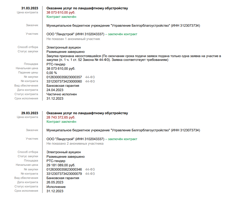 В 2023 году компания «Ландстрой» заключила восемь госконтрактов на сумму более 110 миллионов рублей. При этом все выигранные тендеры заявлены от одной организации — управления «Белгорблагоустройство».