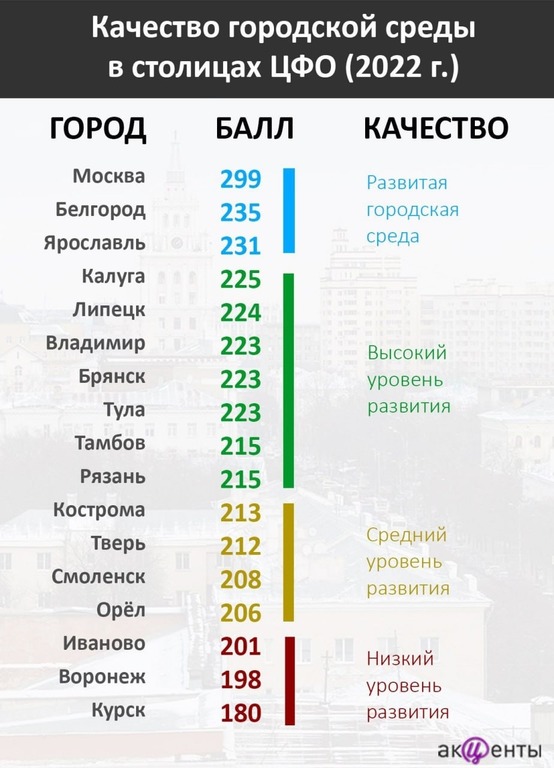 Российский Минстрой опубликовал рейтинг столиц ЦФО. Эксперты оценили качество городской среды и присвоили городам статус от «низкого уровня развития» до статуса «развитая городская среда». Для этого они оценили каждый субъект по 36 критериям, в том числе учитывали безопасность, экологичность, современность городской среды. В итоге Белгород набрал 235 баллов, уступив «золото» Москве. Столица получила 299 баллов. В тройку лидеров также вошёл Ярославль с оценкой в 231 балл.