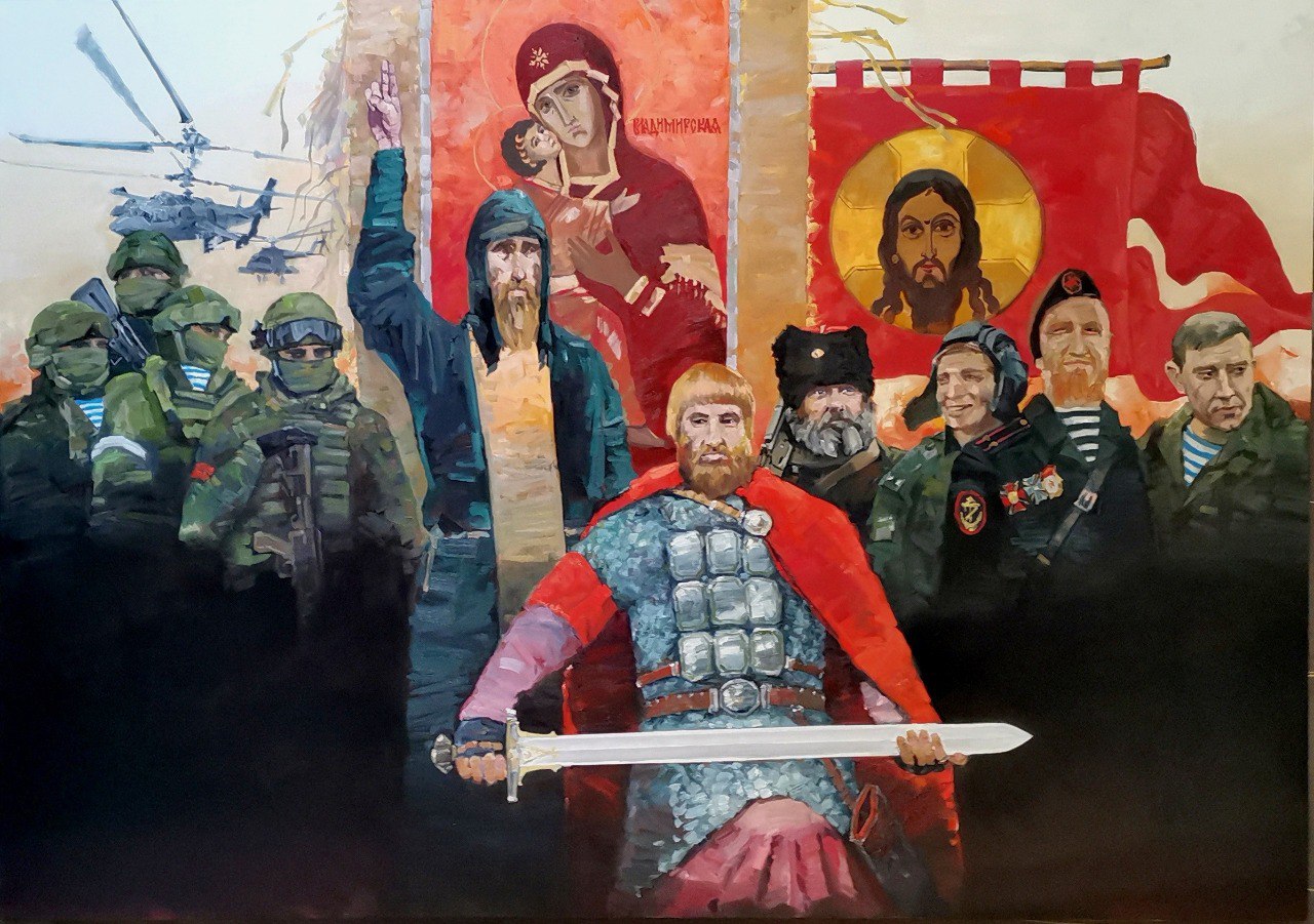 Когда стал возвращаться, стал сразу писать то, что в голове сложилось. Здесь заложен символ — русский крест. Когда я написал икону Владимирской Божьей Матери, я понял, что это образ Владимира Путина. Благословляет Сергей Радонежский Дмитрия Донского освобождать нашу Россию. Герои «русской весны»: Захарченко, Моторола, Гиви, Бородай. С левой стороны — «вежливые люди», наши ребята доблестные, выполнившие свою программу в Крыму безукоризненно...Григорий Новиков, фото с личной страницы vk.com/swift9999
