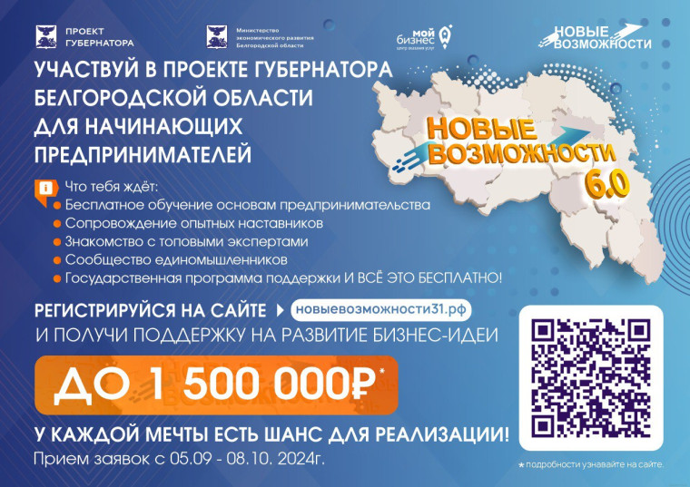 Дорогие жители Белгородской области! У вас есть уникальная возможность развить свою бизнес-идею с помощью программы проекта «Новые возможности 6.0»!