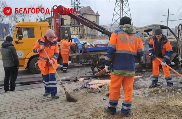 Фото: Белгород-медиа Они вывозили повреждённый транспорт, убирали осколки с дорог и тротуаров, расчищали улицы.