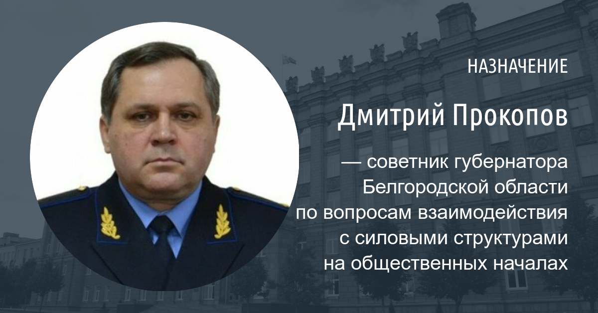 Губернатор Белгородской области Вячеслав Гладков сообщил о новых кадровых назначениях. Советником по вопросам взаимодействия с силовыми структурами на общественных началах назначили Дмитрия Прокопова .