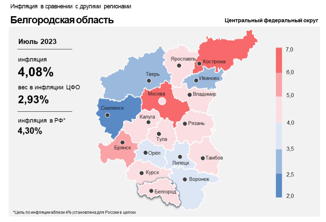 В целом, темп инфляции в Белгородской области сопоставим с ситуацией в Калуге, Туле, Курске, Рязани и Тамбове. В соседних Орле, Липецке и Воронеже инфляция была не такой высокой и не достигла четырёх процентов. Зато в Москве и Костроме этот показатель перешагнул порог в шесть процентов и стал самым высоким в ЦФО.