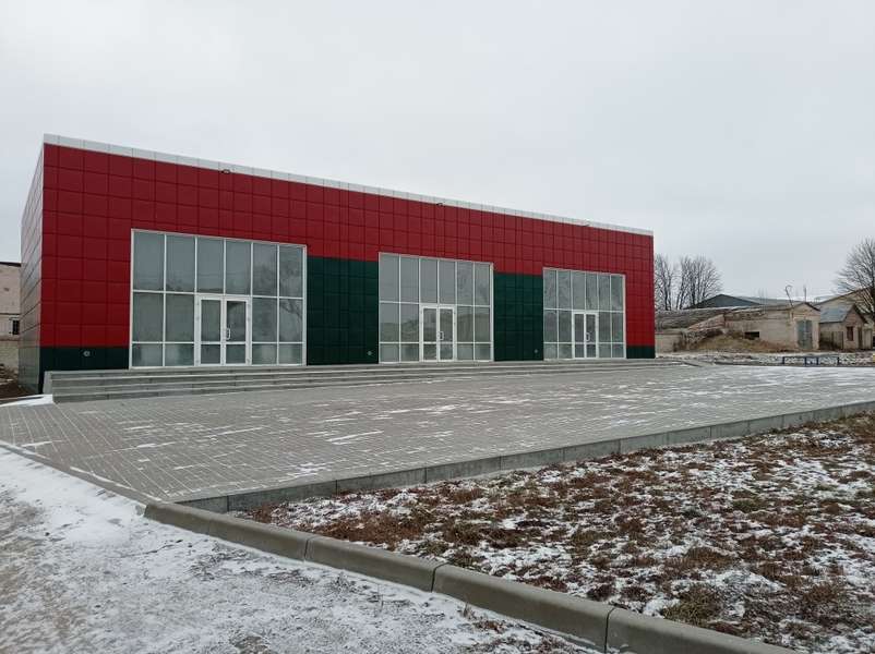 Помимо строительства магазина проектом предусмотрено устройство парковочного пространства, пешеходных тротуаров с твёрдым покрытием и установка малых архитектурных форм. Сейчас подрядчик выполняет благоустройство и озеленение прилегающей территории.