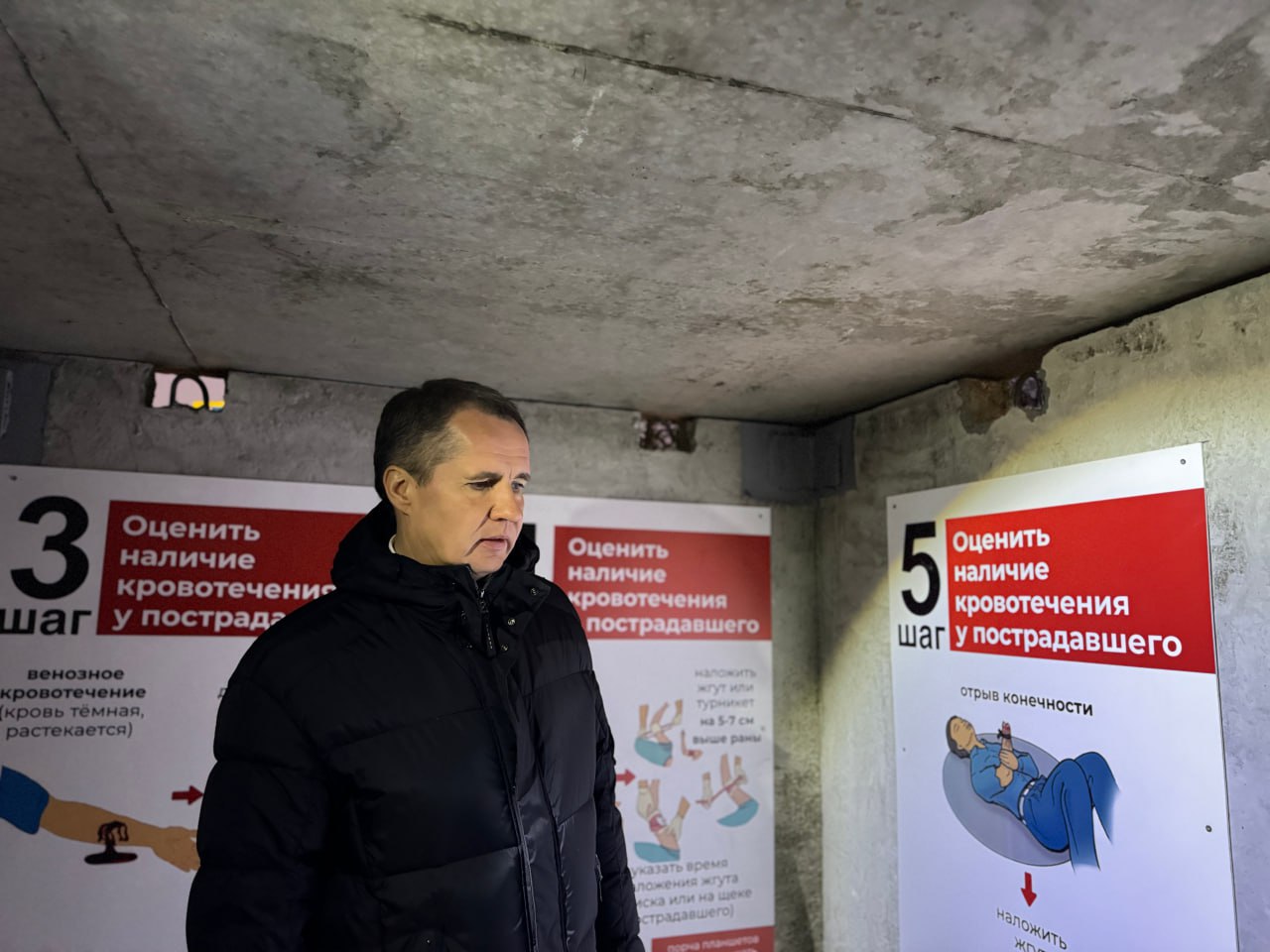 Губернатор Вячеслав Гладков с мэром города Валентином Демидовым и главным врачом белгородской станции скорой помощи Алексеем Жировым осмотрели первое бетонное укрытие, в котором разместили информационные стенды об оказании первой медицинской помощи пострадавшим. Об этом губернатор Белгорода рассказал в своём телеграмм-канале.