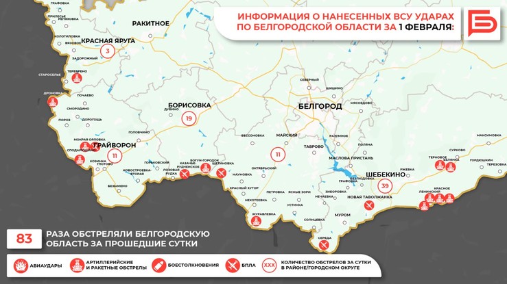 Сводку по обстрелам за 1 февраля предоставил губернатор Белгородской области Вячеслав Гладков.
