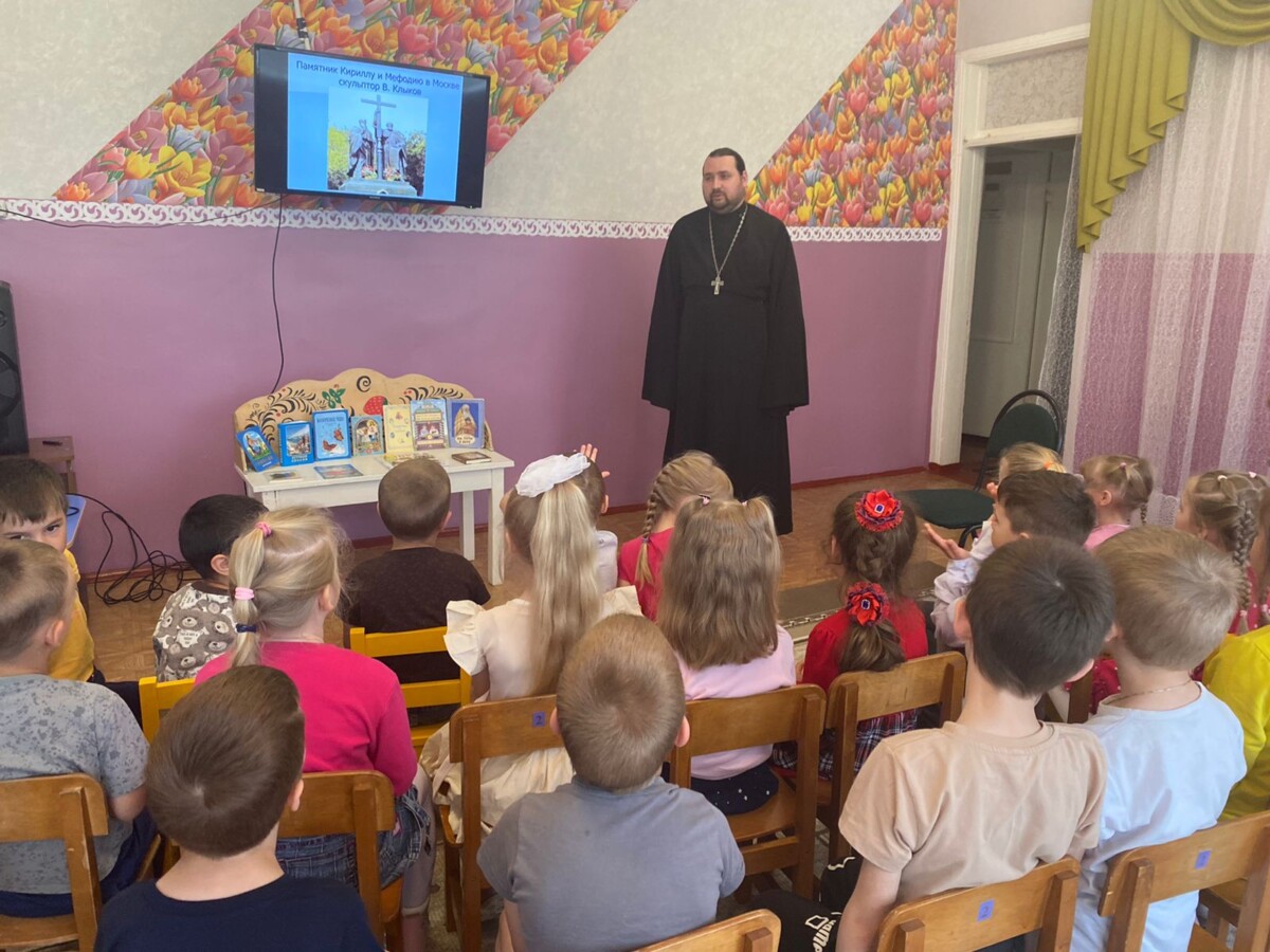 24 мая благочинный приходов II-го Бирюченского округа, настоятель Свято-Успенского храма села Ливенка иерей Евгений Готовкин посетил МБДОУ Детский сад «Улыбка» и провел с детьми беседу в рамках празднования Дня славянско