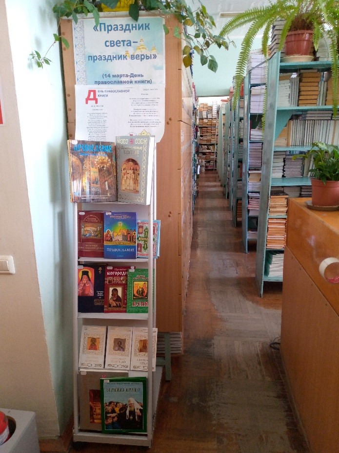 В рамках празднования Дня православной книги в библиотеке оформлены тематические выставки: «Духовной радости сиянье» (801 ауд.) и «Праздник света – праздник веры» (703 ауд.) о христианских мотивах в литературе и живописи, о святынях православия и православных обрядах. Выставки будут действовать с 14 по 28 марта.