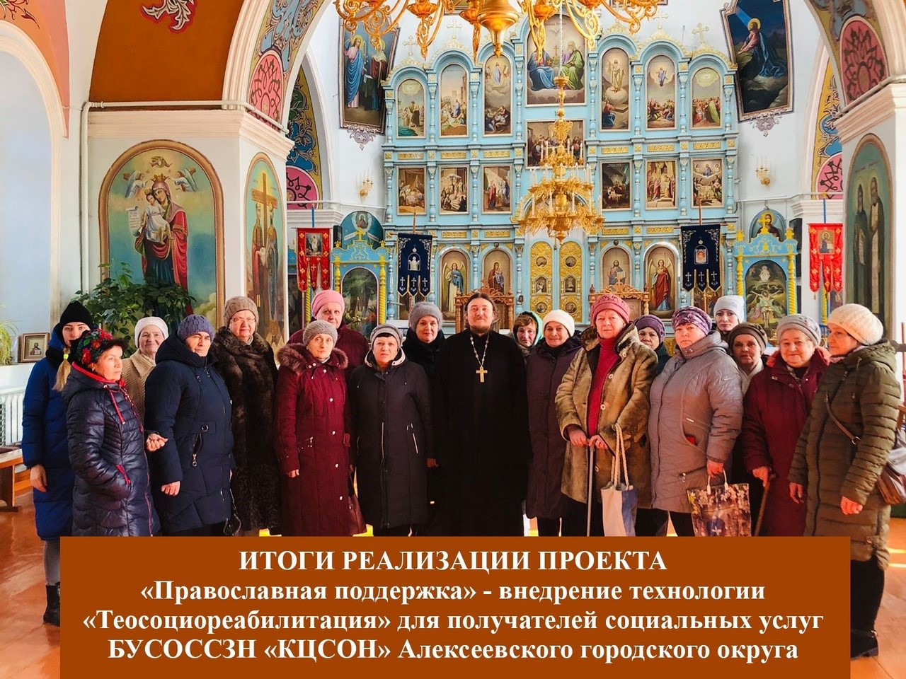 В рамках реализации проекта ««Православная поддержка» - внедрение технологии «Теосоциореабилитация» в работу с получателями социальных услуг БУСОССЗН «КЦСОН» Алексеевского городского округа» достигнут результат проекта «Созданы условия для православного просвещения и духовно-нравственного развития не менее 300 получателей социальных услуг посредством внедрения технологии «Теосоциореабилитация» путем организации и проведения комплекса мероприятий, направленных на духовное развитие получателей социальных услуг.