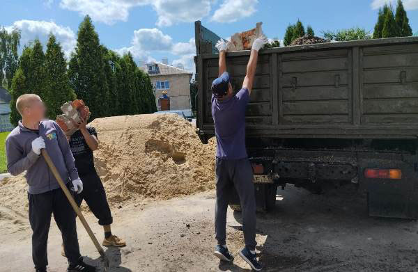 Участники волонтерского движения исправительного учреждения выполнили работы по разгрузке песка, сбору строительного мусора и укладке тротуарной плитки.