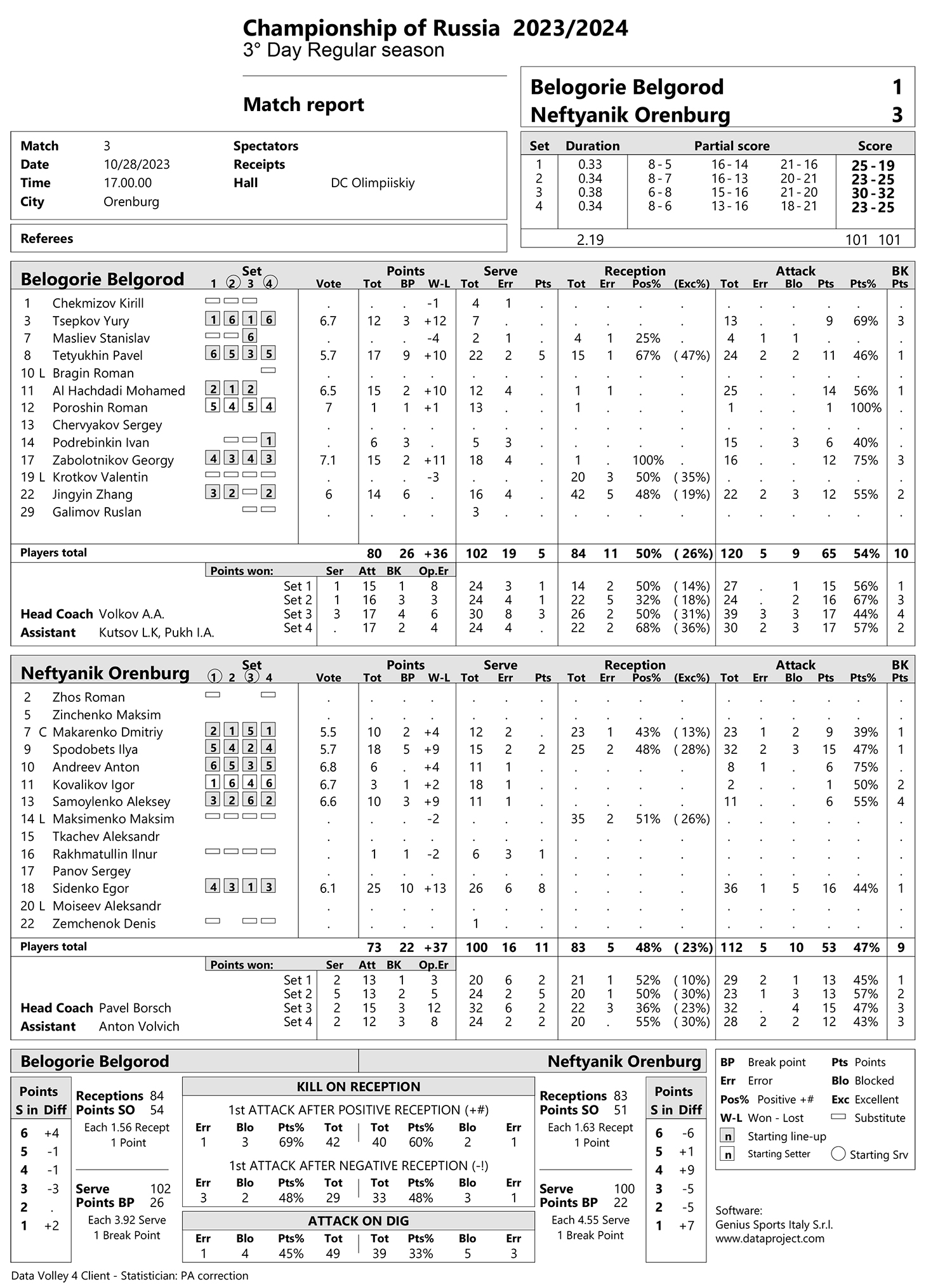 Нефтяник (Оренбург) — Белогорье (Белгород) — 3:1 (19:25, 25:23, 32:30, 25:23)