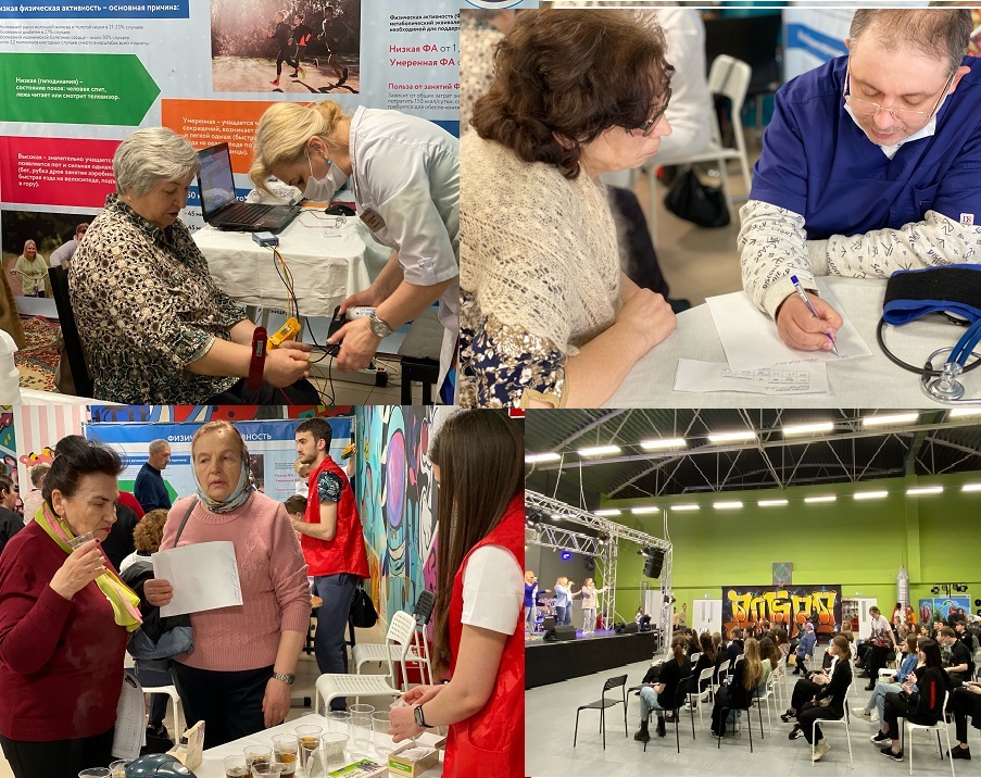 17 апреля с 11 до 14 часов в культурном центре «Октябрь» работали несколько площадок, которые были интересны как молодым белгородцам, так и людям старшего возраста. На одной из них в режиме нон-стоп шло выступление молодёжного вокального ансамбля «Fusion» центра народного творчества «Сокол». Музыкальные номера чередовались с короткими информационными сообщениями о здоровом образе жизни, подготовленными будущими врачами. После творческой программы ребята провели мастер-классы по скандинавской ходьбе, показали гимнастику для суставов, а также самодиагностику рака молочной железы. На другой площадке были развернуты мобильные точки здоровья, на которых каждый желающий мог получить рекомендации по здоровому образу жизни, а также пройти бесплатное обследование состояния своего здоровья. Для того, чтобы иметь представление о работе своего организма, достаточно пройти краткий чек-ап. В него входят всего пять показателей: индекс массы тела, артериальное давление, уровни глюкозы и холестерина в крови, работа сердечно-сосудистой системы. Обследование прошли порядка семидесяти белгородцев. После сдачи анализов и подробной консультации врачей по всем проблемам со здоровьем, они с удовольствием угостились предложенным фиточаем. Ещё около ста молодых белгородцев стали участниками мастер-классов по здоровому образу жизни. О том, как стать донором, рассказал врач-трансфузиолог Центра крови Владимир Жиглин: