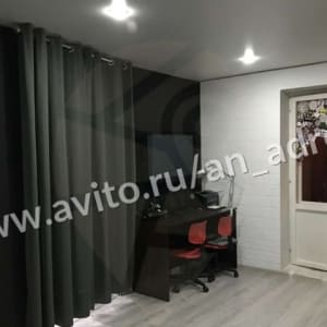 — Потолок нaтяжной, с точечными светильниками; вторая зона - в побелке, с подвесными светодиодными удлиненными панелями (смотрится стильно!);